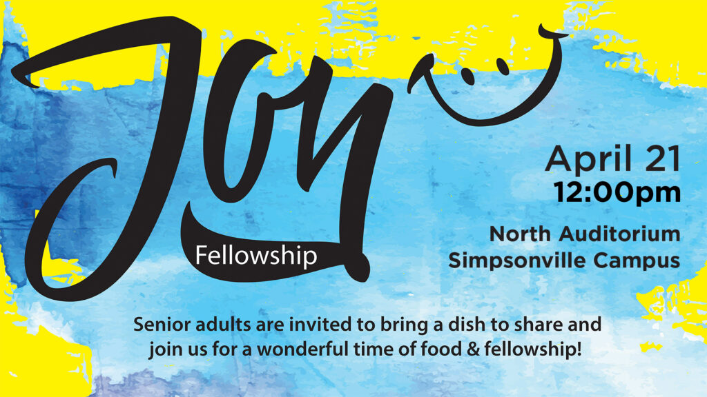 If you are 55+ and are looking for some good food and fun, join us at Joy Fellowship on April 21 at 12pm. This month, Nigel Robertson, WYFF4 Anchor, will be our guest speaker. Remember to bring two side dishes to go with chicken or a dessert. We would love to see you there!