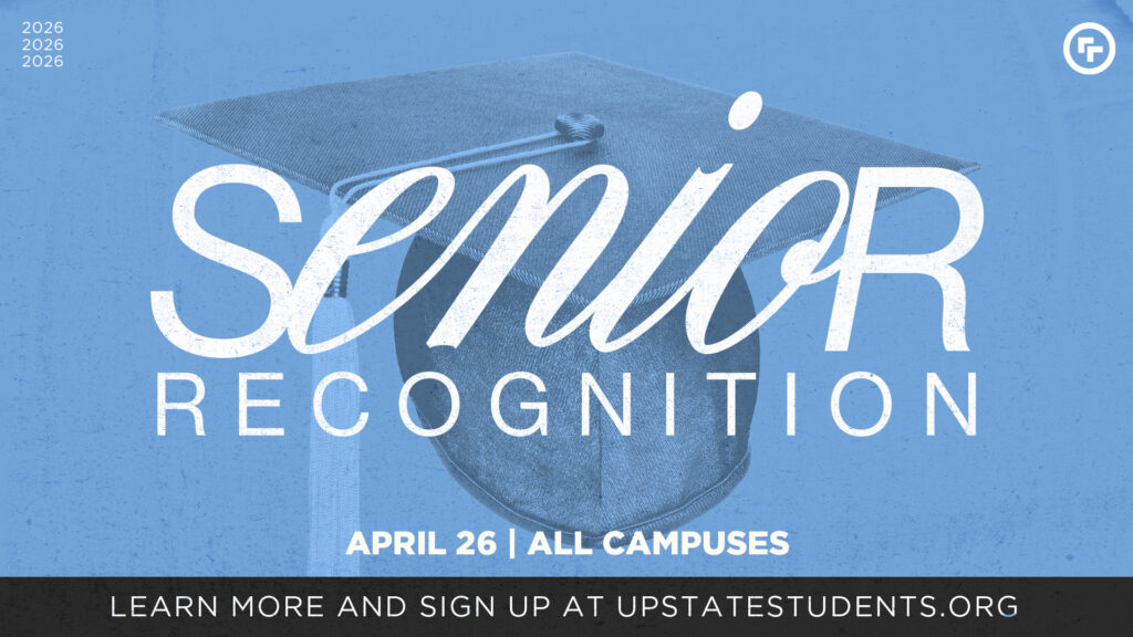 We will have a recognition celebration for high school seniors on April 26! There will be hors devours and coffee followed by leader speeches in the North Auditorium of our Simpsonville Campus from 4-6pm. We will also recognize seniors at all locations during all services in the morning. If you would like to be recognized in service at your location, please register and submit your photos by April 12.