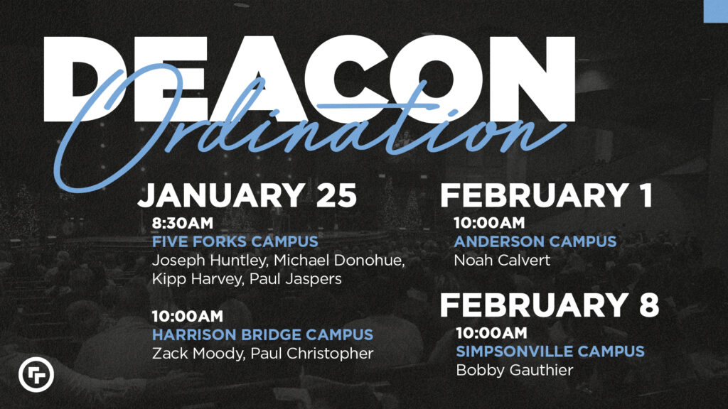We have deacon ordinations coming up at our Simpsonville, Anderson, Five Forks, and Harrison Bridge Campuses. Be sure to note the ordination date for your campus.